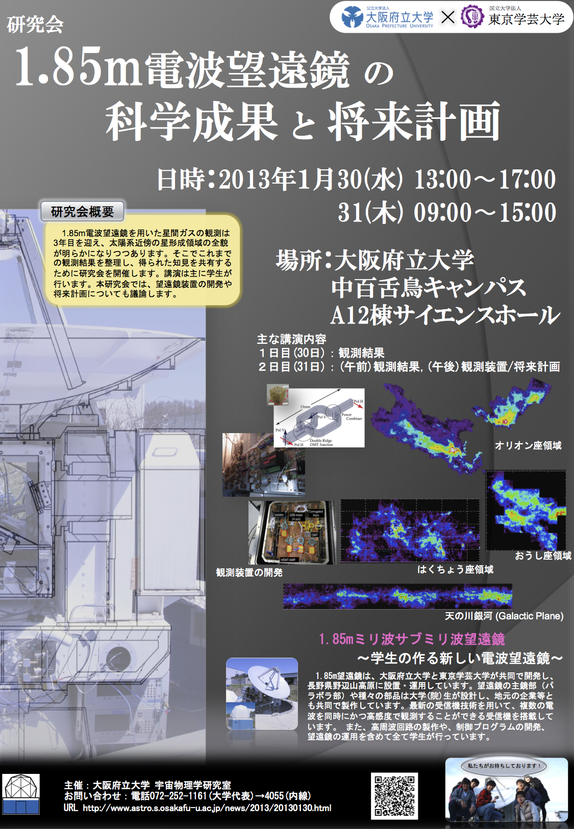 | 内 容 | 大阪府立大学 宇宙物理学研究室では、東京学芸大学と共同で、「1.85m電波望遠鏡」を独自に開発し、天文観測を行っております。この望遠鏡は、星形成過程の解明を目的とし、天の川銀河に存在する星間ガスの観測を行っています。 実際に観測運用を行い始めてから、今年で3年目に突入し、膨大なデータが得られてきました。また、さらに望遠鏡の観測効率を高めるための開発も随時行っています。そこで我々の研究室ではこれまでの観測を振り返り、今後の観測戦略と望遠鏡の開発について考えるため研究会を行うことになりました。 私たちの開発した望遠鏡とその成果について知ってもらうべく、この研究会を一般公開いたします。多くの皆様の参加をお待ちしております。 |