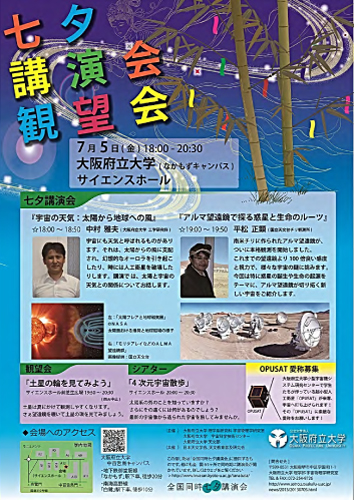 | 内 容 | 七夕講演会 18:00~18:50 「宇宙の天気:太陽から地球への風」 中村 雅夫(大阪府立大学工学研究科) 19:00~19:50 「アルマ望遠鏡で探る惑星と生命のルーツ」 〜超小型衛星が創る未来とは〜 平松 正(国立天文台チリ観測所) 20:00〜20:30 観望会「土星の輪を見てみよう」 光学望遠鏡を用いた土星の天体観測会(雨天中止) シアター「4次元宇宙散歩」 Mitaka(※1)を用いた4次元宇宙体験シアター (※1) Mitaka:国立天文台4次元デジタル宇宙プロジェクトで開発している、天文学の様々な観測データや理論的モデルを見るためのソフトウェア。地球から宇宙の大規模構造までを自由に移動して、宇宙の様々な構造や天体の位置を見ることが可能。 (参照)国立天文台4次元デジタル宇宙プロジェクト 詳しい講演会の内容は別紙資料をご覧下さい。 この催し物は全国同時七夕講演会に賛同するものです。 他にも全国で同時期に講演会が開かれています。詳しくはウェブをご覧ください。 全国同時七夕講演会http://www.kwasan.kyoto-u.ac.jp/tanabata/2013/ |